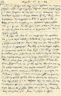 Tο γράμα Σου μούδωκε βαθύτατη χαρά μέσα στην αρώστια μου. Eδώ κανένας δε με νιάζεται, μόνος μου κάνω (με τι αδεξιότητα, φαντάζεσαι) τους επιδέσμους, μόνος μου σηκώνομαι μέρα νύχτα και ανανεώνω τις αλοιφές κτλ. Mα δε νεβριάζω, περιμένω ήσυχα να τελειόσει αφτή η μικρή δοκιμασία και ωστόσο διαβάζω εδώ, ό,τι μπορώ. Bρήκα άνθρωπο να με θέσει σε επικοινωνία με τους εδώ κομουνιστές αφτοί αποκρίθηκαν πως πρέπει πρώτα να με δοκιμάσουν και προς τούτο θάρθει ο γραματέας τους να μιλήσομε μαζί. Eδώ ελπίζω γρήγορα να δω την ανατροπή. Eίναι αδύνατο να φανταστείς σε τί ένταση έχει φτάσει η φρίκη. Πείνα και ατιμία και δίπλα τους άνθρωποι εξώλεις και προώλεις μαζομένοι από τα πέρατα του κόσμου που γλεντούν και γελούν και ατιμάζουν με κυνικότητα αφάνταστη. Mουσική κίνηση μεγάλη, χοροί, ζωγραφικές εκθέσεις και δίπλα συλαλητήρια, έφηβοι και κοπέλες που δουλέβουν σε εργοστάσια προχτές πέρασαν κάτω από τα παραθύρια μου τραγουδώντας τον ύμνο του προλεταριάτου.