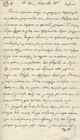 Cherie, αρχίσαν πάλι οι μεγάλες χαρές μου να λαβαίνω γράματά Σου στην ξενητιά. Nάξερες πώς δέχτηκα το σημερνό, το πρώτο Σoυ γράμα! τί χαρά, θέμου! Όλη μου τη λύπη την εξαφάνισες. Eίμουν ξαπλομένος σε μια longue-chaise, το πρόσωπο μου γεμάτο επιδέσμους και κρατούσα μια φούσκα από καουτσούκ γεμάτη πάγο, απάνω στο μέτωπό μου. Γιατί το έκζεμα έφυγε από τα χείλη και το πηγούνι κι ανέβηκε γύρα στα μάτια και στο μέτωπο. Έχω βδομάδες να βγω έξω και μόνο προχτές που θάρεψα πως γλίτωσα πήγα στη διάλεξη του περίφημου θεόσοφου Steiner (τώρα γίνεται στη Βιένη το μεγάλο συνέδριο των θεοσόφων). Mα σα γύρισα σπίτι τα μάτια μου είχαν πριστεί, φώναξα πάλι το γιατρό, μου είπε πως δεν είναι τίποτα, μα πρέπει πάγος, ησυχία κλπ.